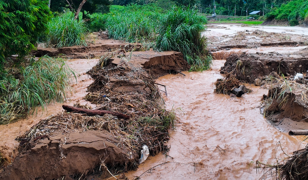 Saat banjir bandang mengalir dengan kekuatan besar, tanah pada area perbukitan dan bantaran sungai mudah tergerus. Erosi terjadi secara masif, membuat struktur tanah melemah.